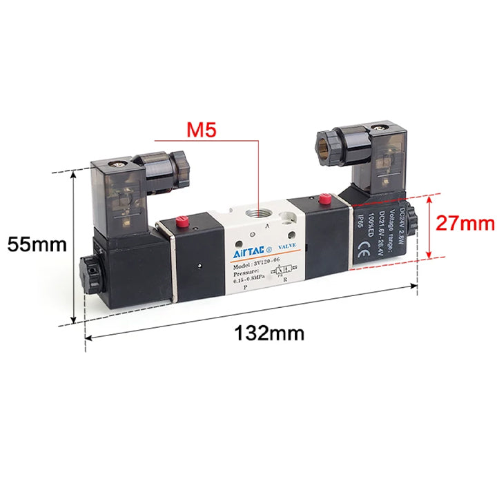 Specifications: three two solenoid valve,Series: 100 series,Electric control mode: double position double electric control,Nozzle caliber: M5,Standard voltage: AC220V,Power connection mode: DIN socket type,Guide mode: internal guide,