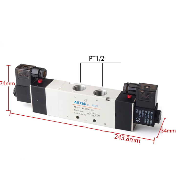 Specifications: five two, five three solenoid valve,Series: 400 series,Electric control mode: three-position double electric control neutral closed type,Nozzle caliber: 1/2",Standard voltage: DC24V,Power connection mode: DIN socket type,Tooth type: PT tooth,Guide mode: internal guide,