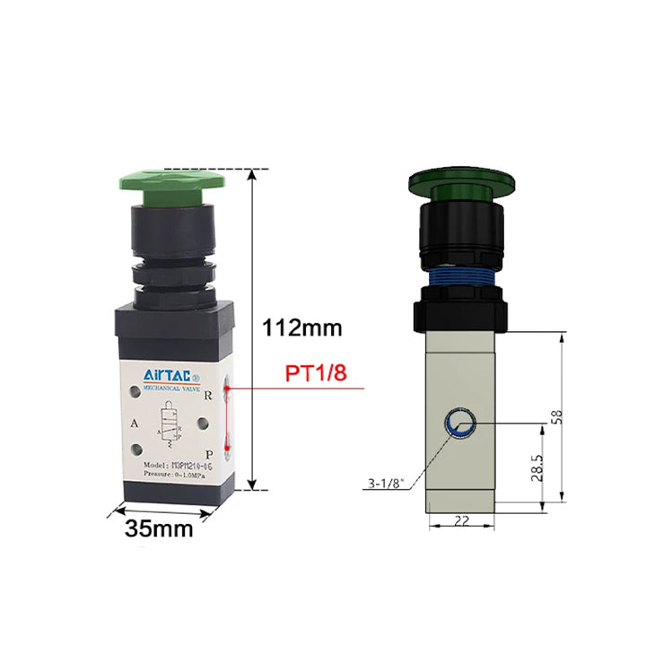 Structure: M type three two,Specifications: mushroom head button type manual valve,Series: 200 series single control,Nozzle caliber: 1/8",Button color: green,Tooth type: PT tooth,