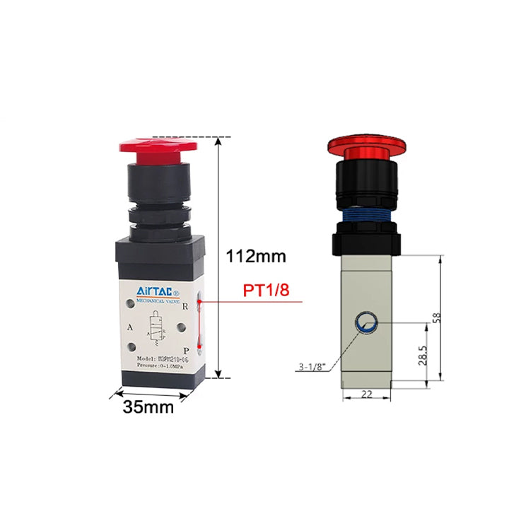 Structure: M type three two,Specifications: mushroom head button type manual valve,Series: 200 series single control,Nozzle caliber: 1/8",Button Color: Red,Tooth type: PT tooth,